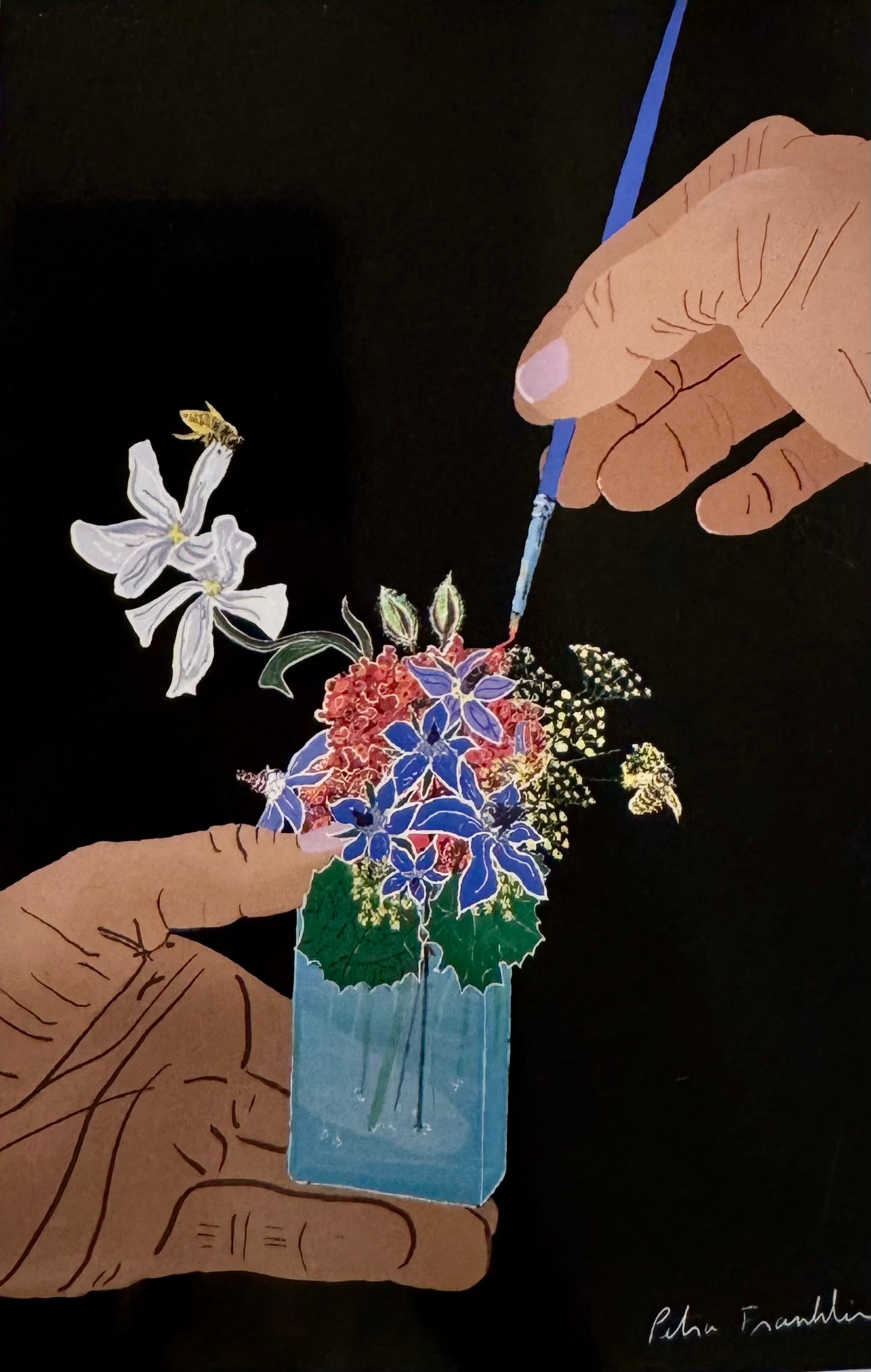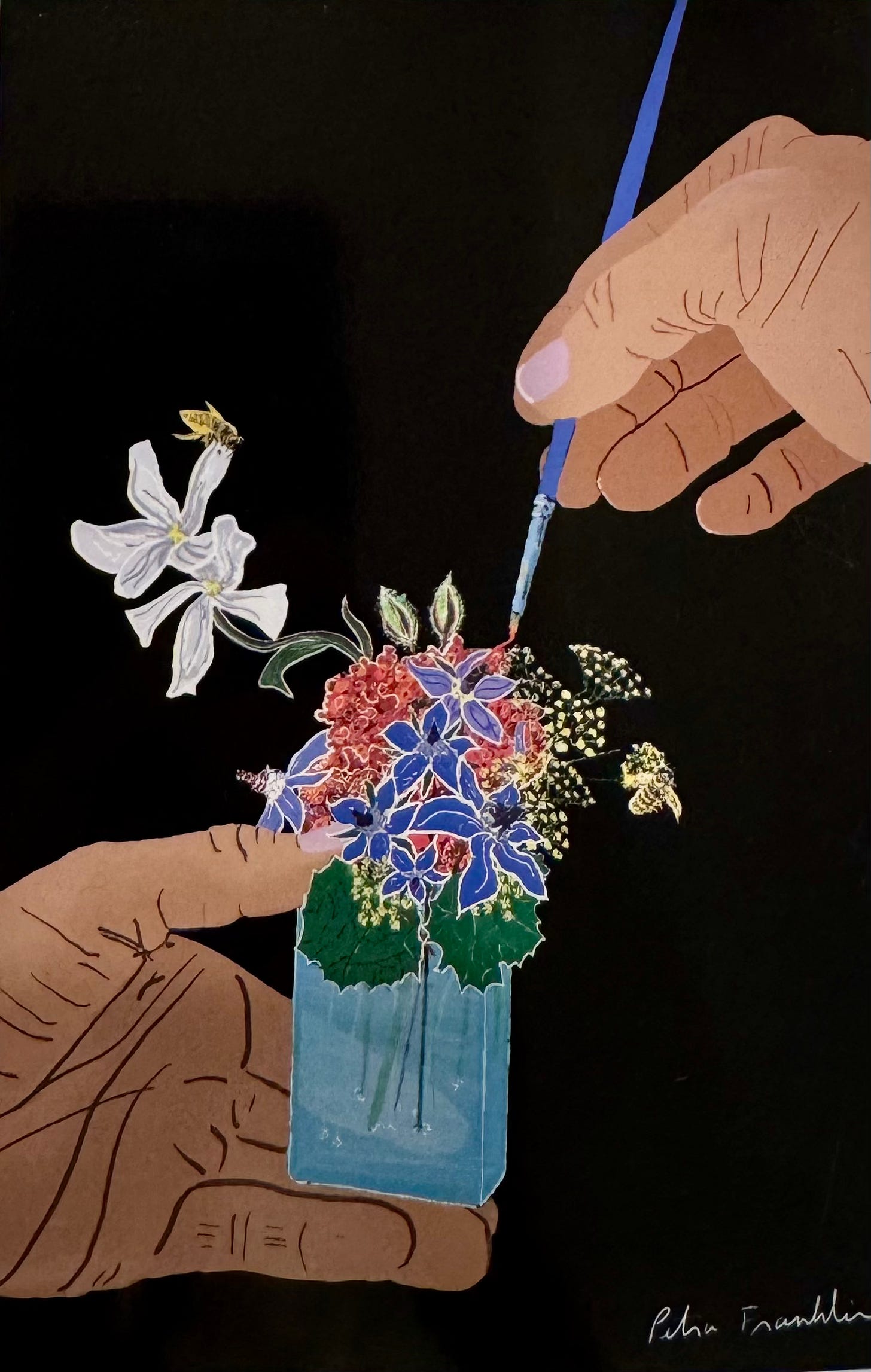The painting today comes from Pollination and Propagation. I painted stems of Jasmine, Sorrel, Shiso, Verbena, and Fennel in a vase. All edible. There are three bees and adventurous roots growing on the stems, that need to be put into dirt.